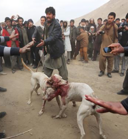 کابل پرس?: افغانستان دوزخی تمام عیار برای نه تنها انسان ها، بلکه برای حیوانات نیز دوزن تمام عیار می باشد. هر از چند گاه از شکار حیوانات نادر در افغانستان می شنویم و یا اینکه بر حیوانات تجاوز می شود و یا حیوانات در حملات انتحاری مورد استفاده قرار می گیرند. سگ بازی در فرهنگ، جمعی از افغان ها ریشه دوانده و در برخی مناطق همچون اطراف شهر کابل تعداد زیادی از مردم جمع می شوند، سگ جنگی براه می اندازند و تعداد زیادی نیز به تماشای سگ جنگی می نشینند.