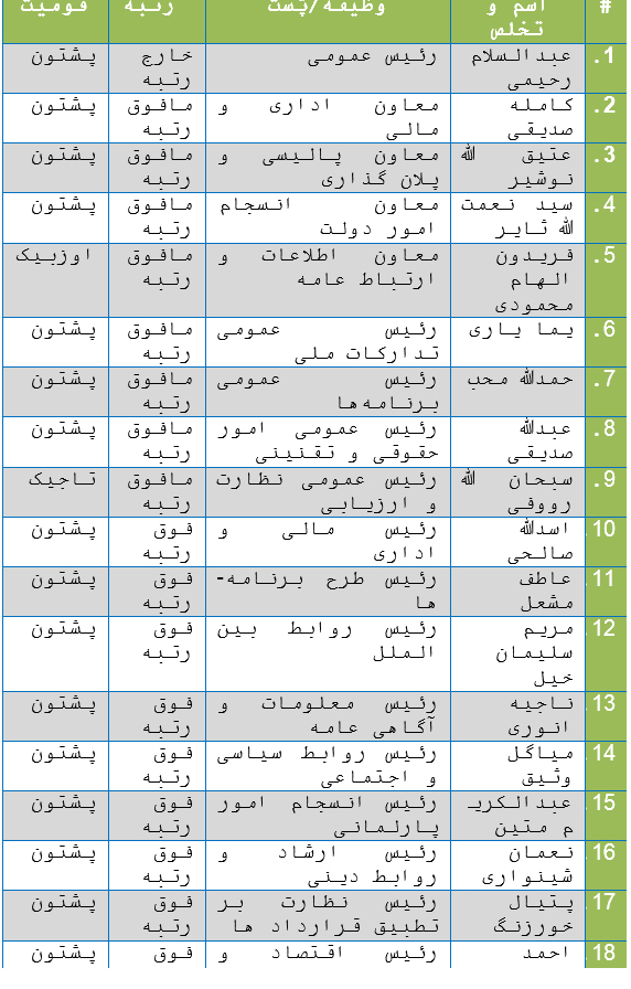 2. اگر به ترکیب قومی انتصاب های اداره امور در گراف مقابل مراجعه کنیم، در می یابیم که شعار یک افغان از یک افغان برتر نیست و نه یک افغان از یک افغان کمتر، در حقیقت به برتری افغان های خاصی نسبت به دیگر افغانها در مفهوم که رئیس جمهور غنی آن را مطرح می کند، شده است. این یعنی اینکه این کشور هیچ گاهی نباید صاحب حکومت ملی و کارا شود.