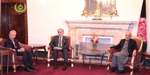 حکومت دست نشانده: ملا اشرف غنی احمدزی و عبدالله عبدالله در حال دادن مدال به سفیر بریتانیا