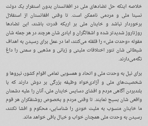 "تا زمانیکه ساختار کلی فدرالی مطابق وضع ساختار قومی, زبانی, دینی, مذهبی و منطقوی جامعه افغانستان تطبیق نگردد, تا زمانیکه مسئله خط دیورند حل نگردد, تا زمانیکه خط قرمز در بین دوست و دشمن وجود نداشته باشد, تا زمانیکه از دین مقدس اسلام سواستفاده سیاسی صورت گیرد, تا زمانیکه احزاب و روشنفکران, وابسته به دولت های همسایه, منطقه و جهان باشد, تا زمانیکه امتیاز ها و تبعیض های قومی, زبانی, دینی و مذهبی از قانون اساسی مملکت برداشته نشود, تا زمانیکه تحمیل نام یک قوم بالای سایر اقوام افغانستان برداشته نشود, تا زمانیکه شهروندان کشور در قوم آریائی "موهوم" نجیب و غیر نجیب تقسیم شوند, تا زمانیکه این اندیشه حاکم باشد که رئیس جمهور از فلان قوم و معاون از فلان قوم باشد, تا زمانیکه صدور قبایل وغصب اراضی مردم جزئ سیاست دولت باشد, تا زمانیکه یک قوم به دولت مالیه بده و قوم دیگر مالیه بگیر باشد, تا زمانیکه یک مردم افسر و دیگری عسکر باشد, عدالت اجتماعی برقرار نخواهد شد و ملتی بوجود نخواهد آمد."