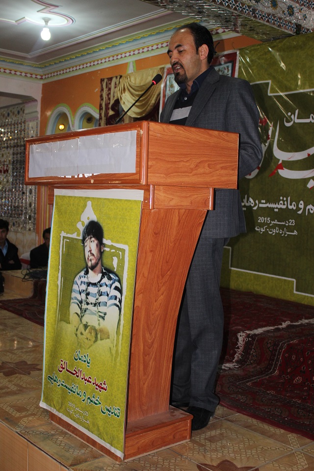در بخشهای از سخنان وی آمده است: ما در شرایطی خالق را فراموش کردیم و نقلقولهای شفاهی و نوشتاری در مورد وی را در تاقچه فراموشی گذاشتیم که در برابر تاریخ فاتحان قرار داریم، تاریخی که از هیچ گونه جعل و تحریف ابایی نداشته و در دههای تحول و دموکراسی کتاب سقوی دوم ویااطلس اتنوگرافی اقوام ساکن در افغانستان (غیر پشتونها) را مینویسند و در آن از هیچگونه تحریف واقعیتهای تاریخی و اهانت و تحقیر به ملت شریف هزاره دریغ نمیورزد.