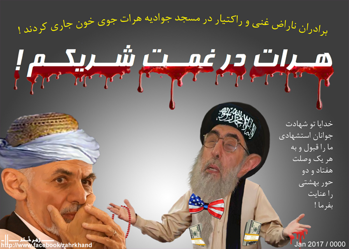 برادران ناراض اشــرف غنــی و همســنگران راکــتیار در مســجد جــوادیه شــهر هــرات جــوی خــون جــاری کــردند.