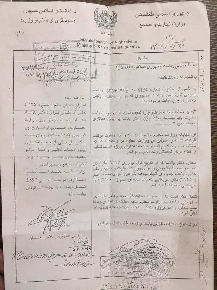 Kabul Press?: A document from Afghanistan’s Ministry of Commerce and Industries shared by local journalists says a German adviser of Ashraf Ghani Ahmadzai had US$41250.00 salary per month in 2017-18. The official document dated 29/07/1396 (21 October 2017) includes the signature of Ahmadzai and his order to add Dr. Wolfgang Plasa’s $41250,00 monthly salary for one year into 1397’s budget, starting from February 2017. According to the document, the annual wage of Wolfgang Plasa as Ahmadzai’s adviser was US$495000,00.