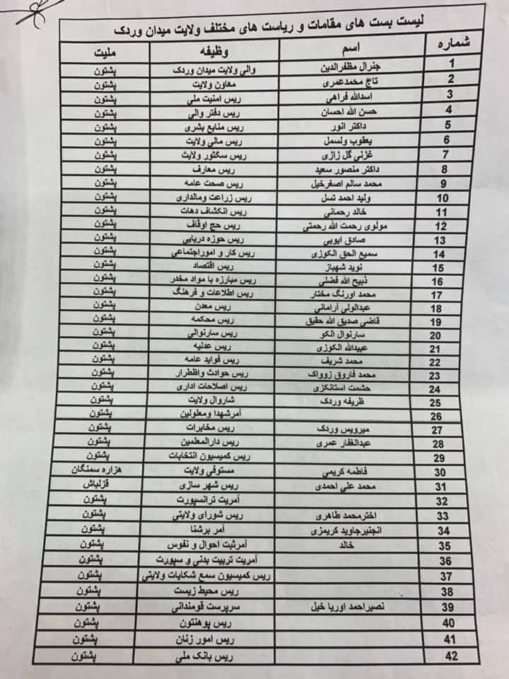 Kabul Press?: A list of officials in Maidan Wardak, Hazaristan, shows that 41 out of 42 officials, including the governor and security commanders, are Pashtuns, and only one of them is a Hazara. Another list containing the name of 32 security officials in Maidan Wardak shows that there is no any Hazara among them. In that list, 9 are Tajik, 2 are Bayat, and the rest are all Pashtuns. Having a province with almost all officials from one ethnic group created a safe haven for the Taliban, who share the same ethnic background.