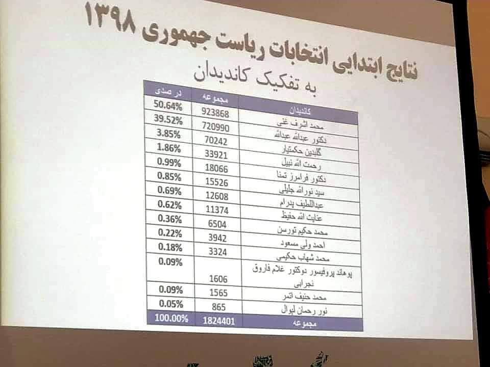 After several months, the Afghani Election commission announced the initial results of the so-called presidential election. According to that commission, out of 1 824 401 votes, Ghani Ahmadzai gained 923 868, and Abdullah Abdulah 720 990.