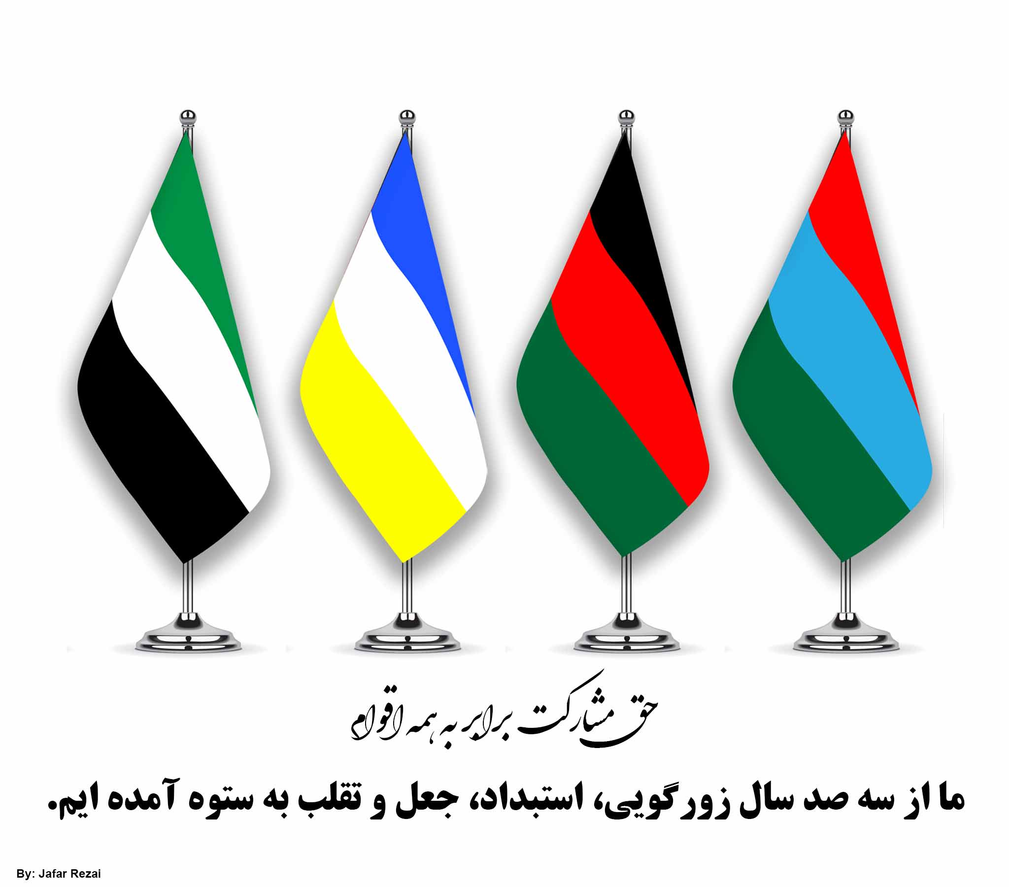 Kabul Press?: A picture designed by Jafar Rezai titled “Equal Rights for All Ethnic Groups,” containing the flag of the Hazara, Tajik, Uzbek, and Pashtun/Afghan shared and circulated by thousands of users in social media including Facebook. Many commented that three centuries of the Pashtun rule on non-Pashtun, dictatorship, fraud, terrorism, and systematic crimes is enough.