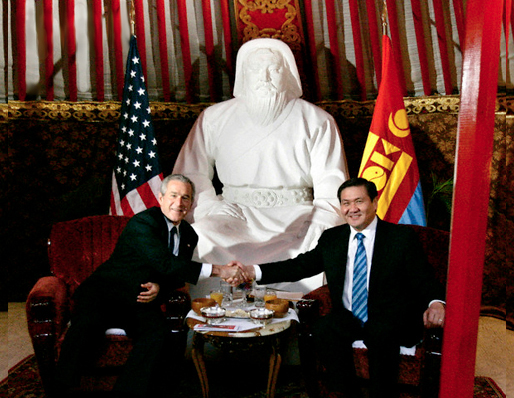 جورج بوش و نمبرین انخبیار ریس جمهور مغولستان در پیشگاه مجسمه چنگیزخان