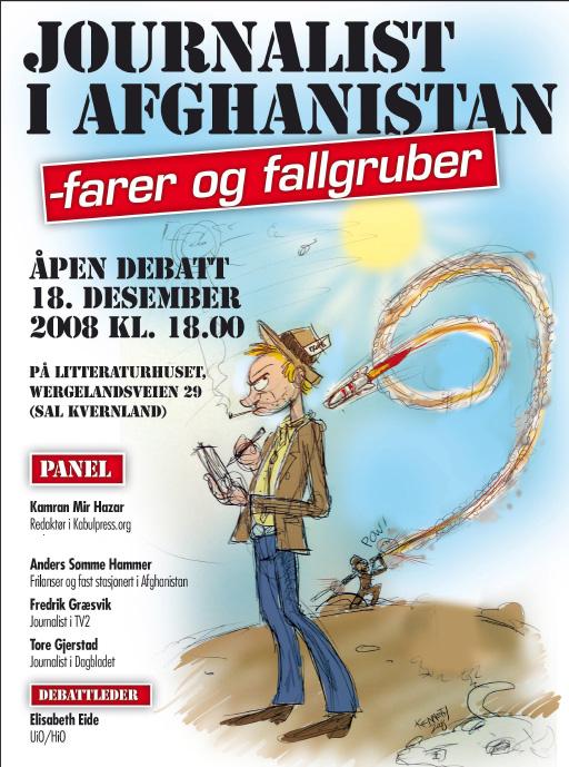 کابل پرس?: روز پنجشنبه هجدهم دسمبر سال روان (ساعت شش بعد از ظهر) يک نشست همگانی و بحث آزاد در زمينه ی کار روزنامه نگاری و پوشش خبری افغانستان، با حضور روزنامه نگاران، نويسندگان و علاقمندان، در خانه ی ادبيات شهر اسلو پايتخت کشور نروژ برگزار می شود. گردانندگی اين نشست را که از طرف دانشگاه اسلو، اتحاديه ی روزنامه نگاران نروژ و باشگاه روزنامه نگاران اين کشور برگزار می شود، اليزابت آيده استاده دانشگاه و معاون انجمن قلم نروژ بر عهده خواهد داشت. در اين نشست کامران ميرهزار سردبير کابل پرس، اندرس سُوُم هامر خبرنگار آزاد، فردريک گرَسويک از تلويزيون 2 نروژ و توره یرستاد از روزنامه ی داگ بلاده ی نروژ درباره ی کار دشوار روزنامه نگاری در افغانستان، خطرات و تهديدات عليه روزنامه نگاران و رسانه ها سخن خواهند گفت. اين روزنامه نگاران همچنين نحوه ی پوشش خبری افغانستان توسط رسانه های محلی و بين المللی و موضوعاتی را که باعث سانسور و فشار بر روزنامه نگاران و رسانه ها می شود، به همراه عوامل فشار، تهديد و سانسور بررسی خواهند کرد.
