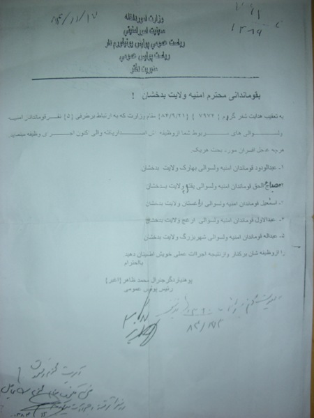اشاره: اين سندی که کابل پرس? افشا نموده به امضای دگر جنرال محمد ظاهر می باشد که در نيمه ی دوم سال 84 ، پنج تن از فرماندهان محلی را از وظايف خود تبديل کرده بود. اين پنج فرمانده ی محلی که در بدخشان مردم از دست آنان روز خوشی ندارند، چند روزی را به کابل آمدند و سپس در بدخشان به همان وظيفه ی خود ادامه دادند. اين سند نشان می دهد که وزارت داخله حتا نمی تواند يک فرمانده درجه پايين را از وظيفه برطرف کند، تا چه رسد به افشای نام مقاماتی که وزير وقت می گفت در قاچاق مواد مخدر دست دارند.
