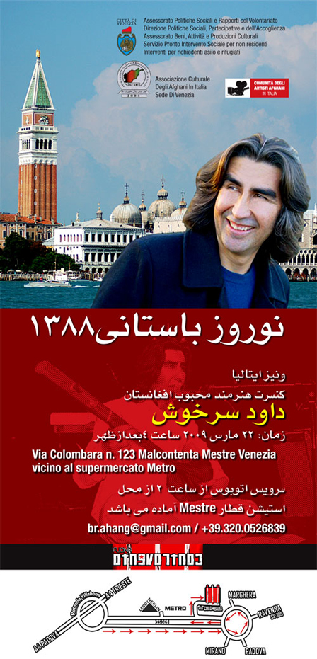 کنسرت نوروزی داود سرخوش/ ونيز، ايتاليا/ 22 مارچ 2009 ساعت چهار عصر/بهار که میشود بادهای جهنمی جنوب به وزیدن شروع میکند وتپه ها تپه ها افیون گل میدهد، امسال فصل تقسیم قدرت نیز درراه است وما میترسیم بار دیگر وطن ما پامال قدرت سالاران نشود، باآنهم ما امسال با نومیدی تمام این جشن را برگزار کرده ایم
