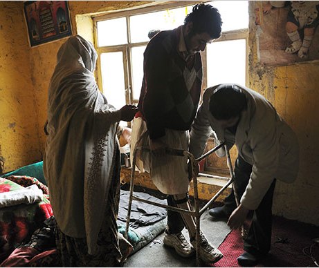 مسعود 20 ساله پاهای مصنوعی را همرای مادر و یک داکتر در کابل امتحان می کنند. مسعود که، این افسر پولیس در یک حمله طالبان زخمی شد.