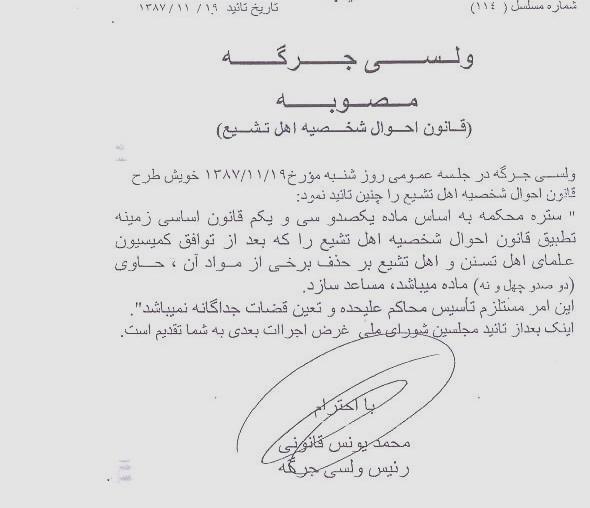 تصويب قانون "احوال شخصیه شیعیان" برای جامعه ای که نوگراست و کوشش می کند مشارکت متمدنانه در جامعه داشته باشد، فقط يک توهين محسوب می شود که ريشخند و محدوديت را برای آنان به ارمغان می آورد.