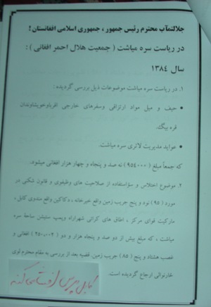 • اين مورد اختلاس و سوء استفاده در جمعيت هلال احمر افغانستان، در گزارش سال 1384 رياست مستقل مبارزه با فساد و ارتشای اداری آمده است. دقت کنيد اين نامه به رييس جمهور نيست، بلکه در بخش کابل پرس? افشا می کند و در زير بخش گزارش سال 1384 رياست مستقل مبارزه با فساد و ارتشای اداری ، در کابل پرس افشا شده است.
