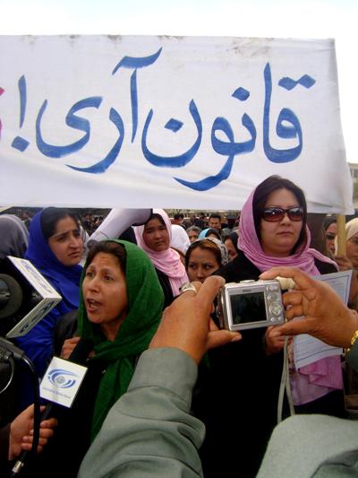 در تظاهرات چند رنگی امروز صدها نفر شرکت ورزیده بودند، از یک طرف فعالین حقوق زنان قانون دموکراتیک میخواهند از طرف دیگر قشر زنان مذهبی دیکته شده توسط شیخ آصف محسنی به مخالفت علیه فعالین حقوق زنان شعار دادند و از قانون شیخ محسنی دفاع نمودند واز سوی دیگری گروه مردان خشمگین با دشنام های رکیک و شعارهای زن ستیزانه شان زنان را دشمنان دین خطاب نمودند و تلاش داشتند تا با خشم و قهر بالای زنان حمله ورشوند که پولس مانع آنها شد. مردان شعار میدادند مرگ به حقوق بشر و مرگ به سیما ثمر