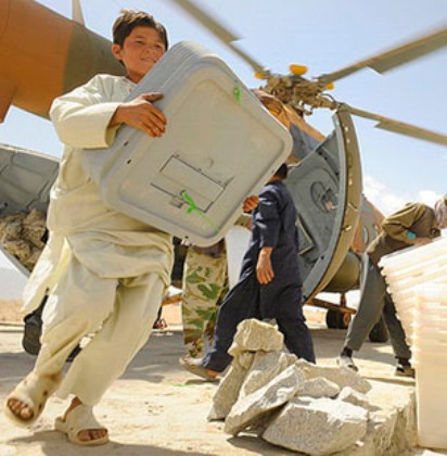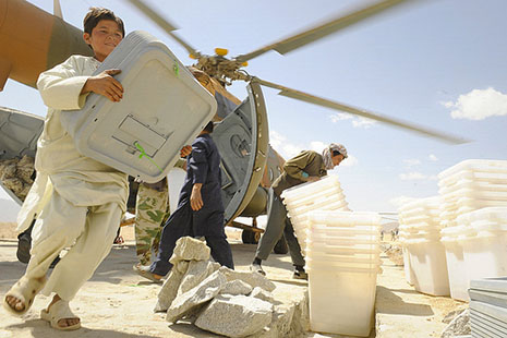 تصویر بالا نوجوان محلی ای را نشان میدهد، که میخواهد صندوقهای رأی دهی را از یک هلیکوپتر ام-17 برای انتخابات تاریخ 18 سپتمبر در ولسوالی جاغوری در افغانستان پایین بیاورد.بیشتر هزاره هاییکه در آسترلیا درخواست و تقاضای پناهندگی داده اند نیز در این ولسوالی بدنیا آمده اند.اما متاٌسفانه آنانیکه در آنجا مانده اند مشکلات قابل ملاحظۀ برای رأی دادن شان دارند.