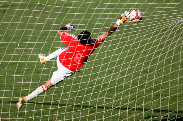 دروازه بان در حال کوشش برای رسيدن به توپ