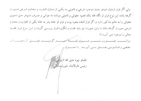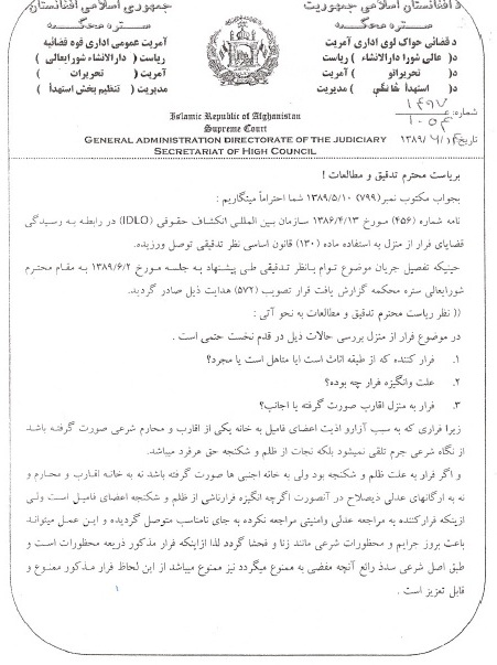 مکتوب شماره 1054/1497 به تاریخ 14/6/1389 در رابطه به فرار از منزل چنین مینگارد: "اگر فرار به علت ظلم و شکنجه بود ولی به خانه اجنبی ها صورت گرفته باشد نه به خانه اقارب و محارم و نه به ارگانهای عدلی ذیصلاح در آنصورت اگرچه انگیزه فرار ناشی از ظلم و شکنجه اعضای فامیل است ولی ازینکه فرار کننده به مراجعه عدلی و امنیتی مراجعه نکرده و به جای نامناسب متوصل گردیده و این عمل میتواند باعث بروز جرایم و محظورات شرعی مانند زنا و فحشا گردد لذا ازاینکه فرار مذکور ذریعه محظورات است طبق اصل شرعی سد ذرایع آنچه مفضی به ممنوع میگردد نیز ممنوع میباشد از این لحاظ فرار مذکور ممنوع و قابل تعزیر است."