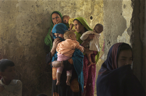 Three Afghan women hold their children in the late afternoon autumnal sun, which is a fortunate moment when one of the biggest challenges that women in Afghanistan face is maternal health and high maternal mortality.