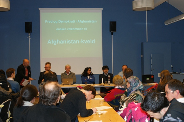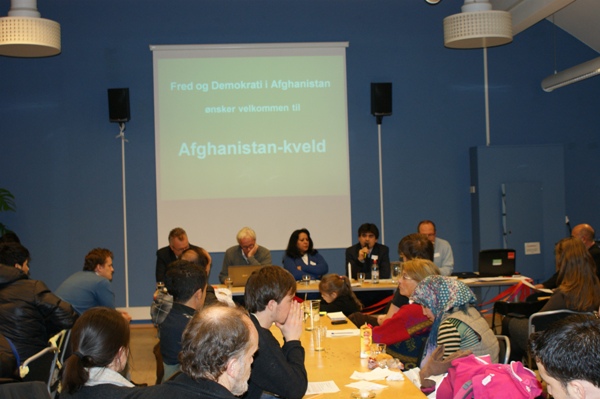 روز پنجشنبه تاریخ 03.12.09 " صلح و دموکراسی در افغانستان" جلسۀ در اوسلو پایتخت کشور نروژ با عنوان "شب افغانستان: یادو بودی از قربانیان، استراتژیی برای بازماندگان" برگزار کرده بود که در آن از نهادهای فرهنگی، سازمانهای ضد جنگ و مدافعین حقوق بشر و همچنین افراد روشن فکر و تحلیلگران سیاسی افغانی و نروژی اشتراک داشتند. این برنامه به بخشهای ذیل تقسیم بندی شده بود.