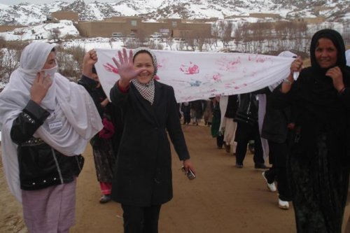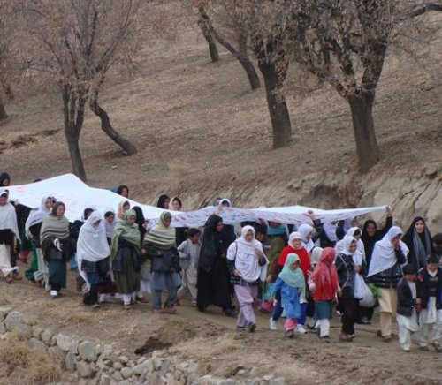 The women in Daikundi issued a declaration of Daikundi women’s needs and desires from the government and international community, which was read by a woman. It was followed by a huge white banner on which all the participants printed their hands with colored paint. About 300 women accomplished a long march of about 4 kilometers from the Nili municipal building to the UNAMA office. Then the banner was given to the head of human rights section of the UNAMA office in Daikundi. This peaceful and unique demonstration, had never been done before in Afghanistan, and the women of Daikundi are proud to have hosted it.