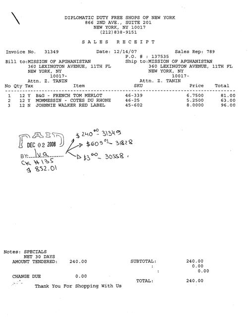 کابل پرس?: ورقه های رسید (فاکتور یا بیل) زیر نشان می دهد که در نمایندگی جمهوری اسلامی افغانستان به مديريت ظاهر طنین، در سازمان ملل مشروبات با درصد بالای الکل نوشیده می شود. با توجه به معلومات درج شده در این رسید ها، مواد الکلی به نمایندگی افغانستان در سازمان ملل متحد فرستاده شده است. در يکی از اين رسید ها نام ظاهر طنین نماینده ی دایم افغانستان در سازمان ملل متحد آمده است. مشروبات الکلی سفارش داده شده از انواع مختلف می باشد. شراب، ويسکی و ودکا. تاکید می شود که این مشروبات الکلی به نام نمایندگی افغانستان در سازمان ملل می باشد به هیچ عنوان مورد شخصی نیست.
