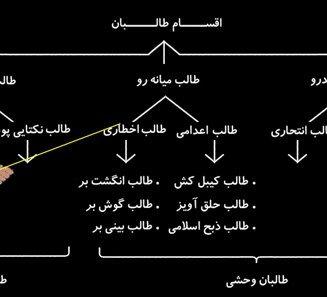 در درس های گذشته گفتيم که سه نوع طالب وجود دارد : طالب تندرو ، طالب ميانه رو و طالب سست رو که هر کدام اينها به نوبه خويش به شاخه های کوچک ديگری تقسيم بندی ميشوند ، طالب تندرو به دو شاخه طالب انفجاری و طالب انتحاری تقسيم شده و ساحه فعاليت تخريبی هردو شاخه را انسان ها ، حيوانات و جمادات تشکيل داده و ابزار کارشان عموما بمب و واسکت انتحاری می باشد .