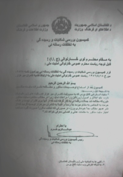 " سايت انترنتی کابل پرس" که به مسووليت کامران ميرهزار فعاليت های ژورناليستيک دارد، بايد اخلاق و اصول ژورناليزم را مراعات نمايد زيرا در مطالب منتشره سايت مذکور طوريکه مطالعه شد جملات و کلماتی به کار گرفته شده که از آنها بوی افترا و تهمت و هتک حرمت به اشخاص به مشام می رسد بنا رسما و اکيدا به کامران ميرهزار توصيه گرديد که از نشر همچو مطالب جدا خودداری ورزد در صورتی که تخلف مکررا صورت گيرد صاحب امتياز سايت مذکور به مقامات عدلی و قضايی معرفی خواهد شد.