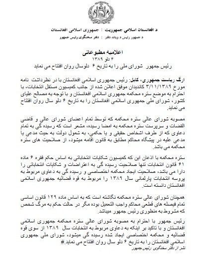 حامد کرزی، رییس باند جنایتکاران، چپاولگران، تولید کنندگان و قاچاقچیان مواد مخدر و فرصت طلبان قبیله، با اشاره به فیصله دادگاه عالی که کاملا وابسته به خود وی می باشد، حاضر شد، پارلمان دوم را روز ششم دلو افتتاح کند