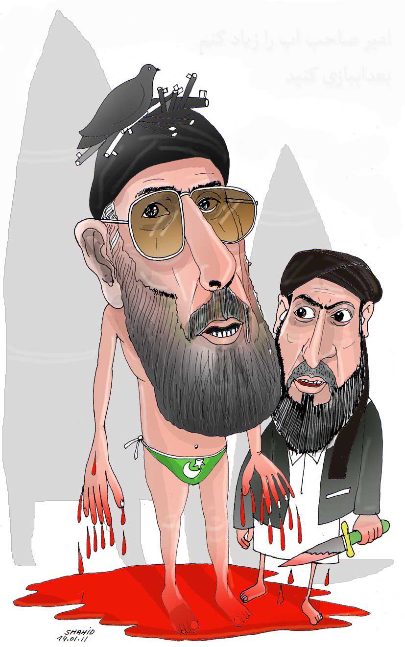 عتیق شاهد ستاره اسلام را به مقابل سر چول حکمت یار صاحب ترسیم نموده است و خود حکمتیار صاحب را مانند زمانه حضرت محمد قداره بدست داده لچ در میان خون ایستاده نموده است . از چهره حکمتیار صاحب معلوم است که ایشان در کشتن هنوز ادامه خواهند داد و با چشمان انتقام جویانه همه شما ها را به جنگ فرا خوانده است . پس این گز و این میدان بفر ماید به جنگ ء امیر اسلامی محمد گلبدین حکمتیار صاحب .