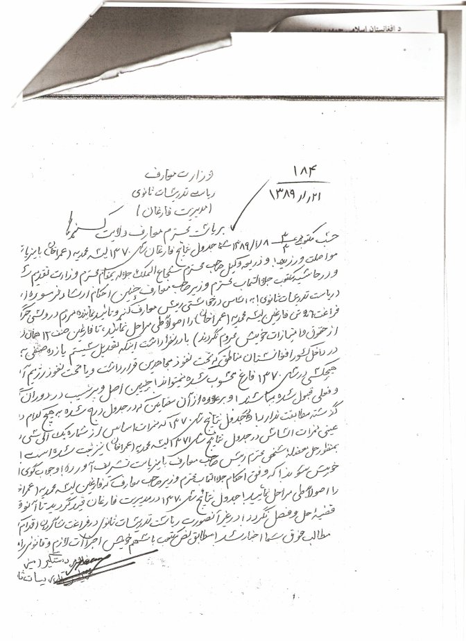 همه امور وزارت معارف امروزدر دست شخص نوپیدا است بنام پتمن. او شب و روز در فکر راندن اقوام دیگر افغانستان از وزارت معارف با حیله های مختلف است. تا جای همه را به تدریج به وطنداران خود و فاروق وردک بدهد. به این اسناد نگاه کنید که به رئیس تدریسات ثانوی امر می کند که فلان شخص که اسناد او هم قانونی نیست: اگر پشتون است خیر است لطف نموده کار شان را اجرا نمائید. اطمینان دهید.