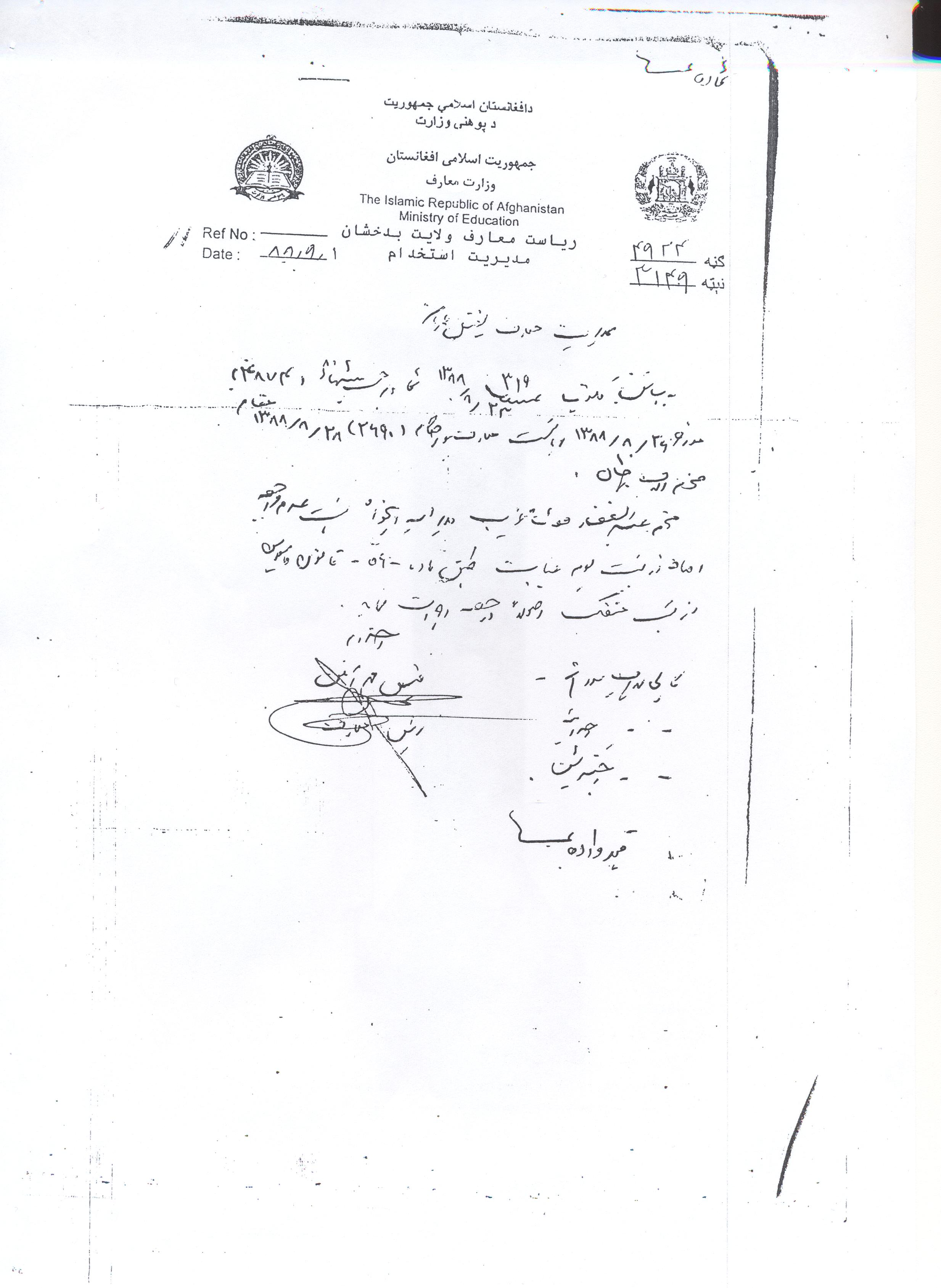 وزارت معارف ایشان را خلاف اصول، قوانین، لوایح، و مقررات معارف به تاریخ 11/07/1389 توسط ریاست معارف بدخشان مجدداً به عنوان مدیر معارف یفتل پایان، معرفی نمودند. بناً بنده ورقه ی عرض را ضمیمه ای کاپی اسناد های فوق به وزارت معارف تقدیم نمودم که وزیر معارف در حشو آن چنین حکم را صادر نمودند: ریاست منابع بشری در توظیف مدیر معارف یفتل پایان در نتیجه یک امتحان سالم در حضور داشت معین تدریسی اقدام نمایید. 22 قوس 1389 فاروق وردک وزیر معارف