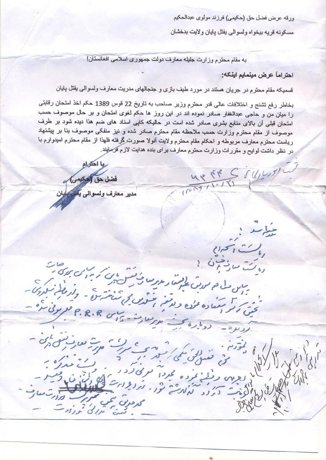 قابل توجه وزارت محترم معارف، بنده فضل حق حکیمی مدیر معارف ولسوالی یفتل پایان ولایت بدخشان هستم مدت 17 سال است که به عنوان آموزگار، مدیر لیسه و مدیر معارف ولسوالی یفتل بدخشان، اجرای وظیفه نمودم. آن گونه که به همه مردم عزیز افغانستان روشن است، پس از روی کار آمدن نظام جدید در کشور، یکی از بخش هایی که انتظار می رفت بدان توجه لازم مبذول داشته شود، معارف افغانستان بود.