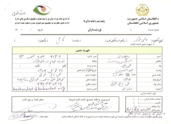 من در آخر دوره کاری 5 ساله وکالت وشروع دوره کاری 5 ساله، فورمه ثبت دارایی های خودرا خانه پرُی کردم و به مرجع قانونی آن فردا میسپارم. دراین مدت وکالت من صاحب کدام نمره زمین، کدام خانه، کدام آپارتمان، کدام رستوران، کدام هوتل، کدام دکان، کدام شرکت نشدم.
