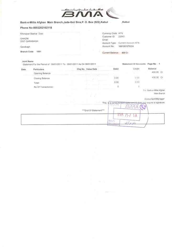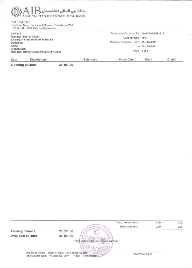 سه حساب بانکی دارم که در یک آن چهار صد افغانی است ودر حساب بانکی دوم من بیست وشش هزار و سه صدو پنجاه و یک افغانی و در حساب سوم من یکصد و یک آیرو یعنی در حدود شش هزار افغان است.