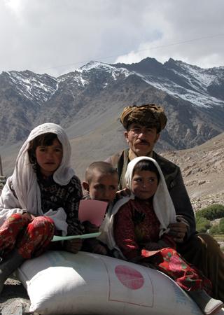 اعضای يک خانواده در ولسوالی واخان ولايت بدخشان روی بوجی های گندم نشسته اند که ازجانب سازمان خوراکی جهان برای شان داده شده است.