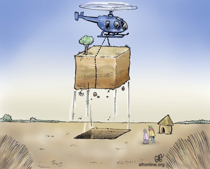 همین دورنما در شرق افریقا نیز هست: در مقابل دریافت 40 هزار هکتار زمین در کناره رود تانا Tana کشور قطر به کنیا یک ملیون قرضه برای بنای بندری دارای عمق زیاد داد. اما رودها و مناطق پر آب واقع در دلتای رودخانه تانا نه فقط برای محیط زیست و آب زیان و گیاهان، دارای اهمیت می باشند، بلکه به اهالی امکان تهیه مواد غذائی و محصولات سبدی Cash corps مانند برنج، ماهی و سبزیجات را نیز می دهند. و گله داران نیز آنجا برای آب دادن به گله هایشان، به ویژه در ایام خشکی که سایر برکه ها خشک می شوند، منبع حیاتی می باشند.