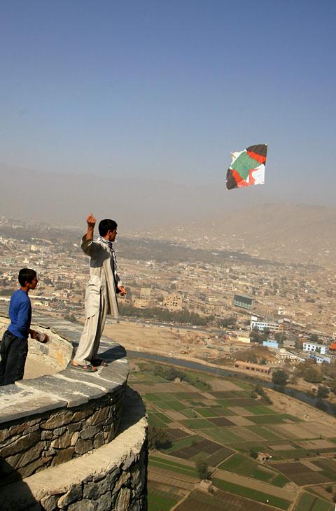 يک پسر در تپه مرنجان شهر کابل کاغذ پران بازی می کند، در روز های جمعه ورخصتی تعداد زياد از پسران دراين جا گرد هم جمع آمده و مسابقات کاغذ پران بازیرا براه می اندازند.