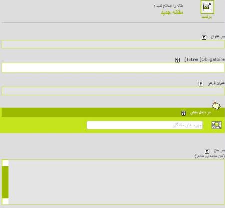عنوان: در اين قسمت بصورت پيشفرض نوشته شده است: " مقاله جديد". لطفا دو کلمه " مقاله جديد" را حذف و عنوان اصلی نوشته ی خود را در اين قسمت بنويسد. عنوان بصورت درشت و کلان در هنگام انتشار ديده می شود. دقت کنيد که عنوان خوب در جذب مخاطب تاثير زيادی دارد.