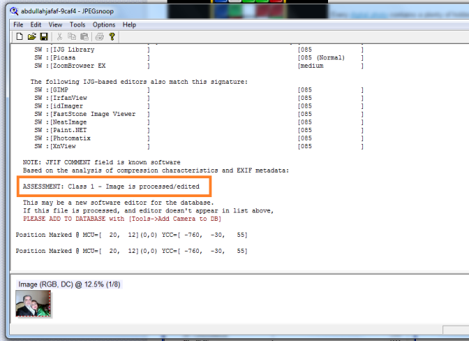 1) با استفاده از نرم افزار رایگان بنام "JPEGsnoop" می توان با چند کلیک، جعلی بودن آن عکس را تثبیت کرد: