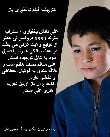 علی دانش بختیاری : سهراب متولد 1994 درولسوالی جغتو از توابع ولایت غزنی می باشد. در هفت سالگی همراه با فامیل خود به کابل کوچیده است. علی متعلم صنف هفتم است و علاقه مندی به فوتبال، خطاطی و نقاشی دارد. گدی پران باز اولین تجربه هنری علی است.