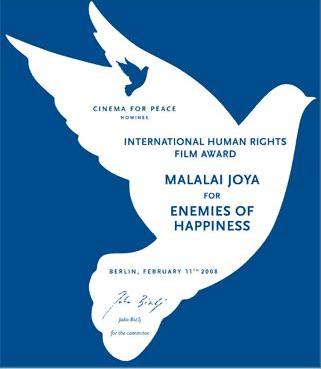 در مکتوب کمیته ی «سینما برای صلح» عنوانی ملالی جویا گفته میشود: «شما برای جایزهای در ۲۰۰۸ نامزد شدهاید، زیرا ما معتقدیم که کار شما در فيلم "دشمنان خوشبختی" سهم ارزندهای در جنبش صلح و همسویی ایفا نموده است.»