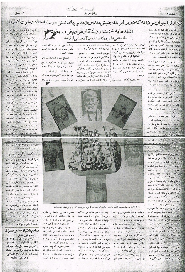 سند ذیل بهترین زبان گویای آن جنایت در آن مقطع تاریخی است که بقلم شادروان غلام نبی خاطر در شمارۀ 21 حمل 1343جریدۀ پیام امروز منتشر گردیده است. لطفاً زحمت خواندن آنرا هم بخود هموار سازید!!