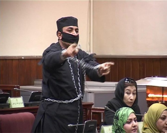 عبدالرحیم ایوبی در اعتراض به روند برگزاری جلسه روز گذشته مجلس نمایندگان و در اعتراض به عملکرد هئیت اداری در این جلسه که اجندای آن استیضاح وزرای مالیه و داخله بود، دست ها و پاهای خود را با زنجیر بسته و در جلسه امروز این مجلس حاضر گردید.