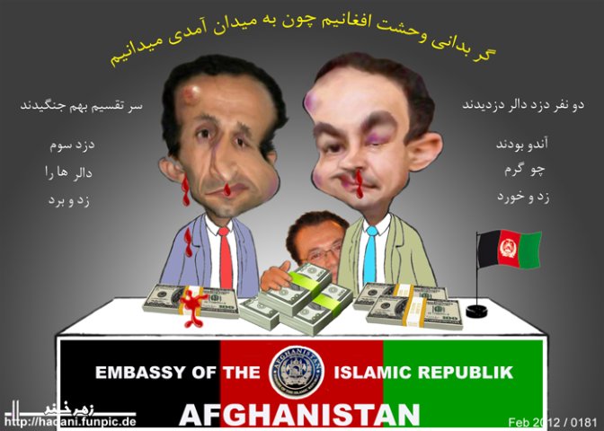 طبیعیست که هر سفیر و نائب سفیر باند های شخصی خودشان را دارند و گاه و ناگاه بر سر تقسیم غنایم دیموکراسی و بازار آزاد تنش های لفظی و برخورد های فزیکی میان شان بوجود می آید که چندی قبل پولیس واشنگتن شاهد زد و خورد خونین میان اعضای سفارت جمهوری اسلامی افغانستان در واشنگتن بود.